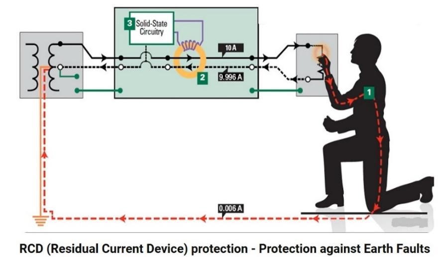 في حالة التوصيلات الكهربائية التقليدية، تتمُّ عملية الحماية بواسطة فُـيُوز أو قاطع الدائرة MCB Miniature Circuit Breaker، وذلك ضد القصر، أي: تلامس الطرف الحي مع النيوترال فقط، ولكنه لا يحمي من الصدمات الكهربائية الناتجة عن تيار التسريب نتيجة تلف العزل، وجسم الإنسان له مقاومة في حدود (1000 أوم)، ولذلك إذا قام أحد الأشخاص بلمس الطرف الحي، فبالتبعيَّة سوف يمرُّ تيار خلال جسم الإنسان تكون قيمته في حدود (30 مللي أمبير)، وهذا التيار غير كافٍ لفصل الفُـيُوز، أو قاطع الدائرة، ولكن هذا التيار يكون قاتلًا للإنسان.