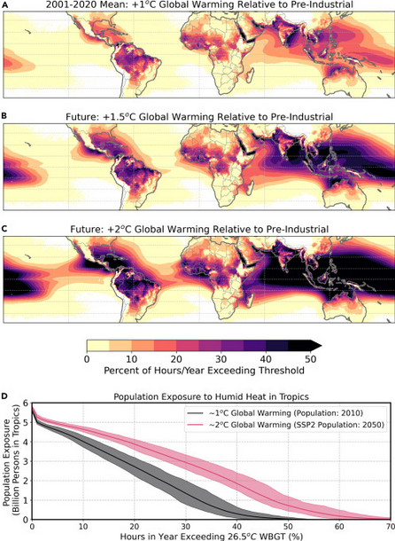 وفي ظلِّ الاحترار العالمي في المستقبل: من المتوقَّع أن تزداد درجة الحرارة والرُّطوبة النوعيَّة فوق مناطق الأراضي المداريَّة، وتُظْهر النماذج المناخية أنَّ الحرارة الرطبة المحلية (على سبيل المثال: Tw، WBGT) على مناطق الأراضي الاستوائية ستزداد بحوالي (0.8 درجة مئوية – 1.4 درجة مئوية) لكل درجةٍ من الاحترار العالمي خلال جميع أشهر السَّنة، بِغَضِّ النظر عن سيناريو الاحترار؛ لذلك: حتى في ظلِّ (0.5 درجة مئوية إضافية – 1 درجة مئوية من الاحترار العالمي)، سيتأثَّر العمال في الهواء الطلق بكلٍّ من التوسُّع المكانـي، وزيادة نسبة ساعات النهار (العمل) الَّتي تتجاوز عَتَبات التعرُّض الآمن للحرارة (الشكلان B وC).