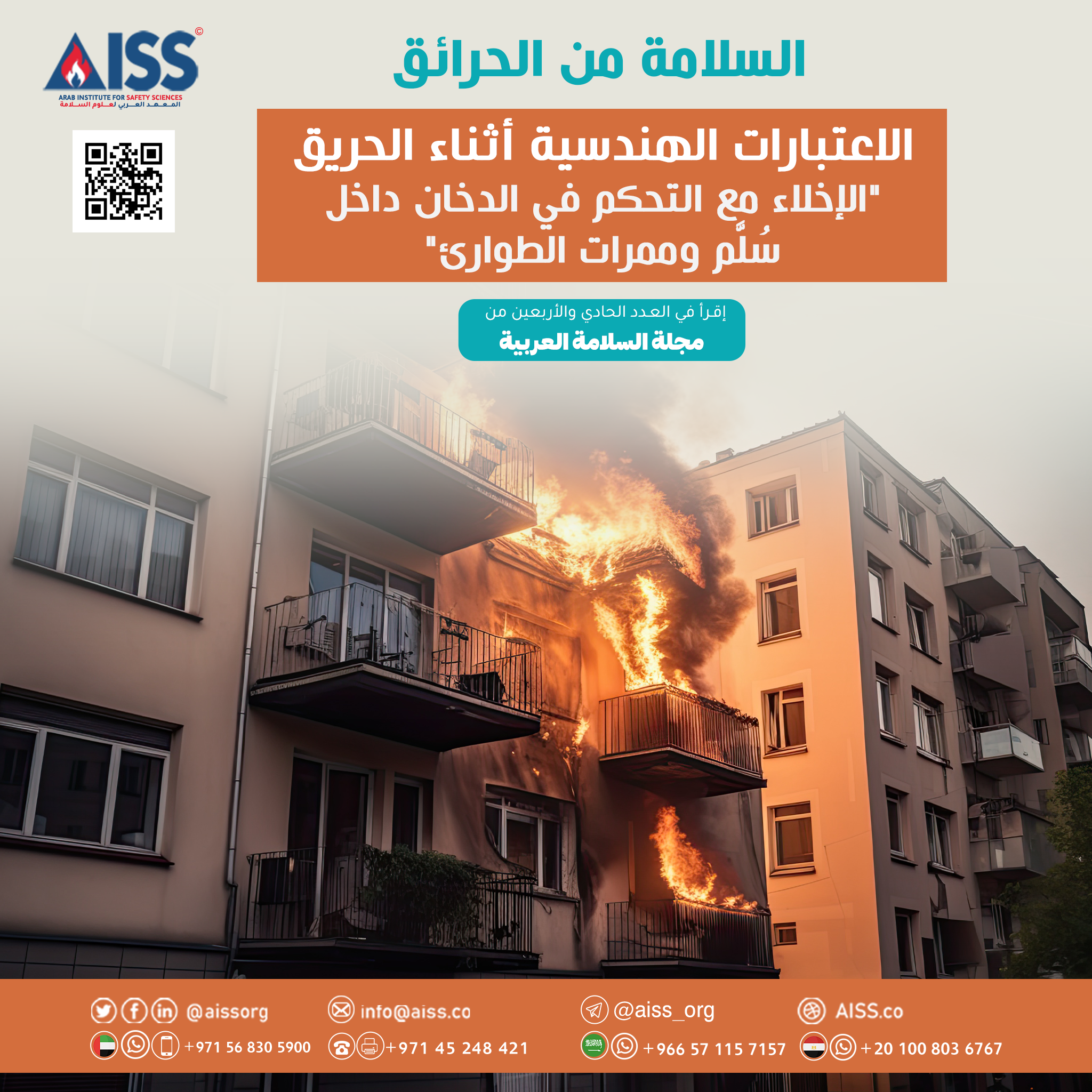 عملية حماية الإنسان من الموت خنقًا بالدخان أثناء الإخلاء الآمن هي الهدف الأول في مكافحة الحريق، وتتطلَّب اعتبارات هندسية في التصميم؛ منها: دراسة العوامل المؤثرة على حركة الدخان، وضغط الهواء داخل سلالم الهروب، وحساب قدرة مراوح الشَّفط للدخان، والضواغط الكافية لمنع تسريب الدخان إلى أماكن إخلاء الأفراد مع استخدام برامج كمبيوتر للمُحَاكاة، والحسابات المُعقَّدة من أجل حماية الإنسان.