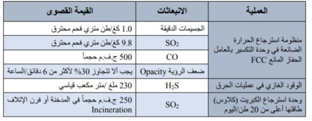 ويُبيِّن الجدول التالي القِيَم القصوى لبعض انبعاثات مصافي النفط في المعايير الوطنية لدولة الكويت: