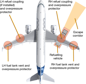 كمعيارٍ صناعيٍّ، يجب احترام منطقة أمان بطول (3 أمتار) حول المنطقة الواقعة أسفل الفتحات الَّتي توصي بها (اللَّجنة الاستشارية الوطنية للملاحة الجوية) National Advisory Committee for Aeronautics NACA، وواقيات الضَّغط الزائد، ووصلات التزوُّد بالوقود. الشكل (3)، ويجب أن تكون هذه المناطق خاليةً من أي شيءٍ أو أفرادٍ، ويمكن العثور على موقعهم في إجراءات سلامة التزوُّد بالوقود الخاصة بـ AMM / AMP / MP، بالإضافة إلى ذلك يجب أن يكون ممرُّ الهروب خاليًا من العوائق حتى تتمكَّن مَرْكبة التزوُّد بالوقود من مغادرة المنطقة في حالة الطوارئ.