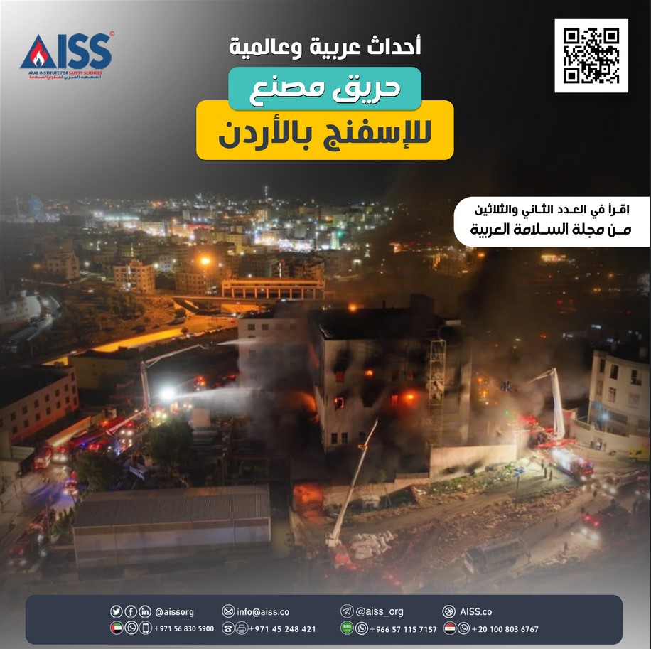 في الثالث عشر من يوليو الماضي، اندلع حريقٌ هائل بمصنع للإسفنج في منطقة رأس العين وسط العاصمة الأردنية (عَمَّان)، وصرح المتحدث باسم مديرية الأمن العام الأردني أن فِرق الإطفاء بذلت جهودًا كبيرة في عمليات الإخماد، لا سيَّما مع الارتفاع الكبير في درجات الحرارة، وقد شارك في عمليات إخماد الحريق العشرات من آليَّات الدفاع المدني العملياتية، وعدد كبير من رجال الإطفاء والشرطة وقوات الدرك، وعدد من صهاريج المياه التابعة لأمانة عَمَّان الكبرى. واستغرقت عمليات إخماد الحريق عدَّة ساعات متواصلة، وذلك نظرًا لطبيعة المواد المحترقة، والتي نتج عنها تصاعد كثيف للدخان، ولم ينتج عن الحريق أي إصابات بالأرواح، وتمَّ فتح تحقيق لمعرفة سبب الحريق.