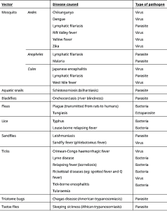 (الملاريا، ومرض لايم، وحمى الضنك، والبلهارسيا، وداء الليشمانيات، ومرض شاغاس، وداء المثقبيات الأفريقي، وغيرها).
