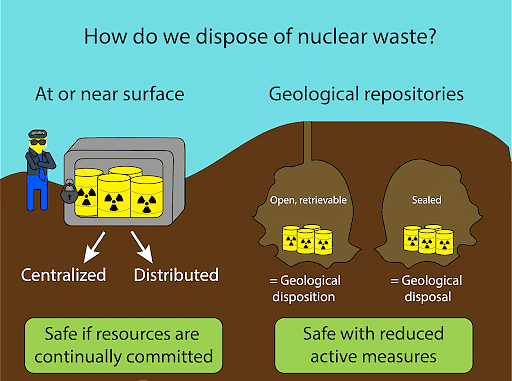- التخلُّص الجيولوجي العميق: يُسْتخدم للنُّفايات عالية النَّشاط، والوقود النَّووي المستهلك؛ حيث تُدْفن النُّفايات في تكوينات جيولوجيَّة مستقرَّة على أعماقٍ كبيرةٍ؛ ممَّا يضمن عَزْلها عن المحيط الحيويِّ لفترات طويلة جدًّا.