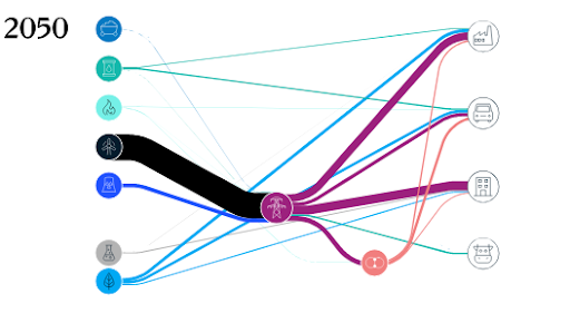 يتطلَّب التحوُّل نحو صافي انبعاثات صفريَّة استبدال الطاقة المتجدِّدة وطاقة الهيدروجين بالكهرباء والحرارة القائمة على الأحفوري، مع موازنة الطَّلب على الطاقة بأسعار معقولة مع تحوُّل العالم. الشكل (1). يُوضِّح التوقعات حتى عامي 2030 و2050، وكيف يمكن لهذا التحوُّل أيضًا أن يُعزِّز السلامة في كهربة الصناعة والنقل والبناء، مع إضافة وقود وهيدروجين مستدامين جديدين إلى العمليات الصناعية والنقل.