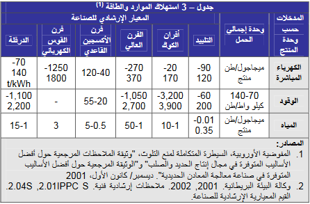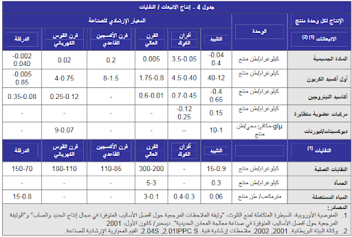 ويقدم الجدول (3) أمثلةً على مؤشرات استهلاك الموارد للطاقة والمياه في هذا القطاع، في حين يُقدِّم الجدول (4) أمثلةً على مؤشرات الانبعاثات، وتوليد النُّفايات، ويتمُّ توفير القِيَمِ المرجعيَّة للصناعة لأغراض المقارنة فقط، ويجب أن تستهدف المشروعات الفرديَّة التحسين المستمر في هذه المجالات.