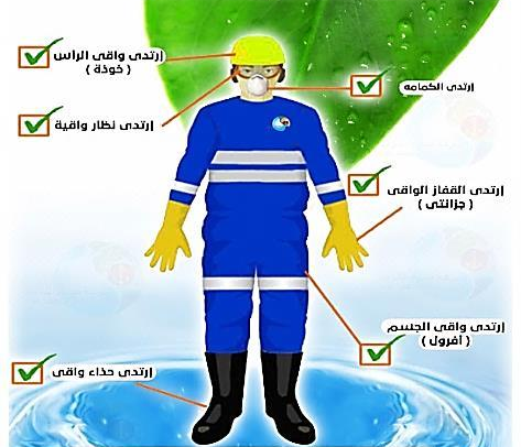 1- عند العمل بأحواض المعالجة يجب تغطية كامل الجسم، وعدم تَرْك أي جزء مكشوف للحماية من رذاذ المياه والحشرات الضارَّة كما بالشكل.