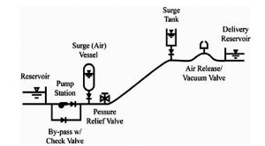 2 ـ خزانات الحماية: في الحالات التي لا يمكن فيها التحكُّم في قِيَم الضغوط العابرة في الناقل أو المجموعة عن طريق تعديل عملية إغلاق المضخة، أو التخفيف من سرعة تباطؤ المضخة، فإنَّ تحويل جريان السائل إلى خزانات حماية قد يُخفِّف من معدل تباطؤه، ومن ثَم من قِيَم الضغوط الناتجة.