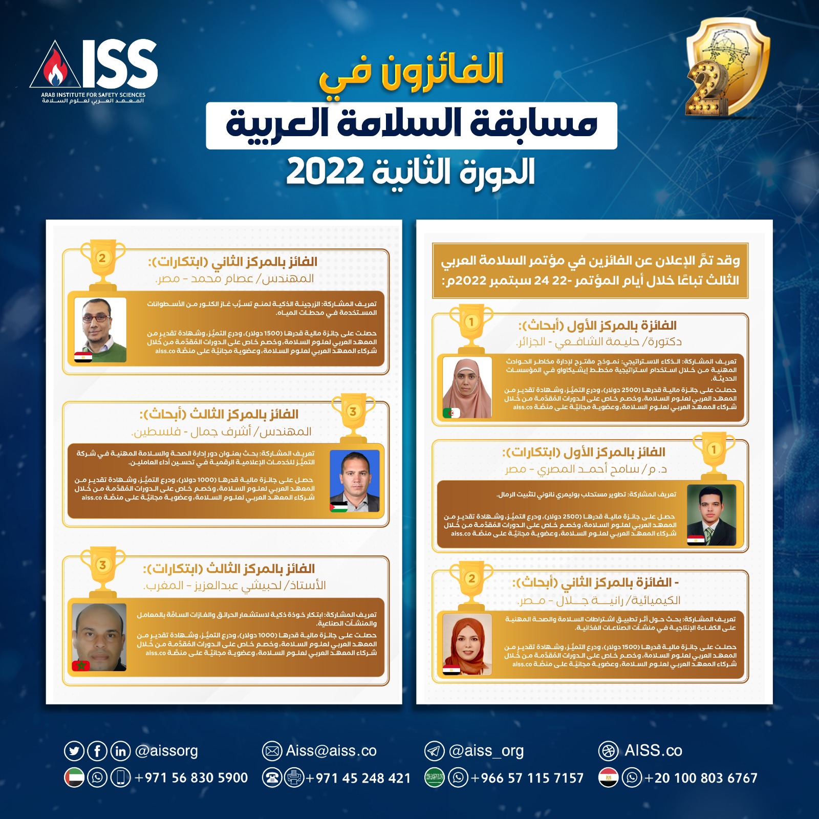 - نشر أسماء الفائزين في (مجلة السلامة العربية) ، وعلى جميع منصَّات المعهد العربي لعلوم السلامة.