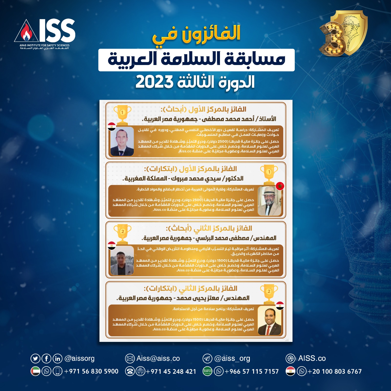 - نشر أسماء الفائزين في (مجلة السلامة العربية) ، وعلى جميع منصَّات المعهد العربي لعلوم السلامة.