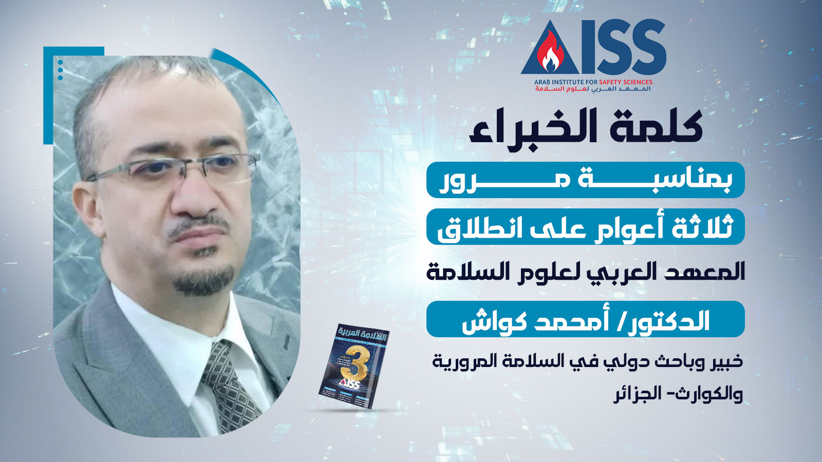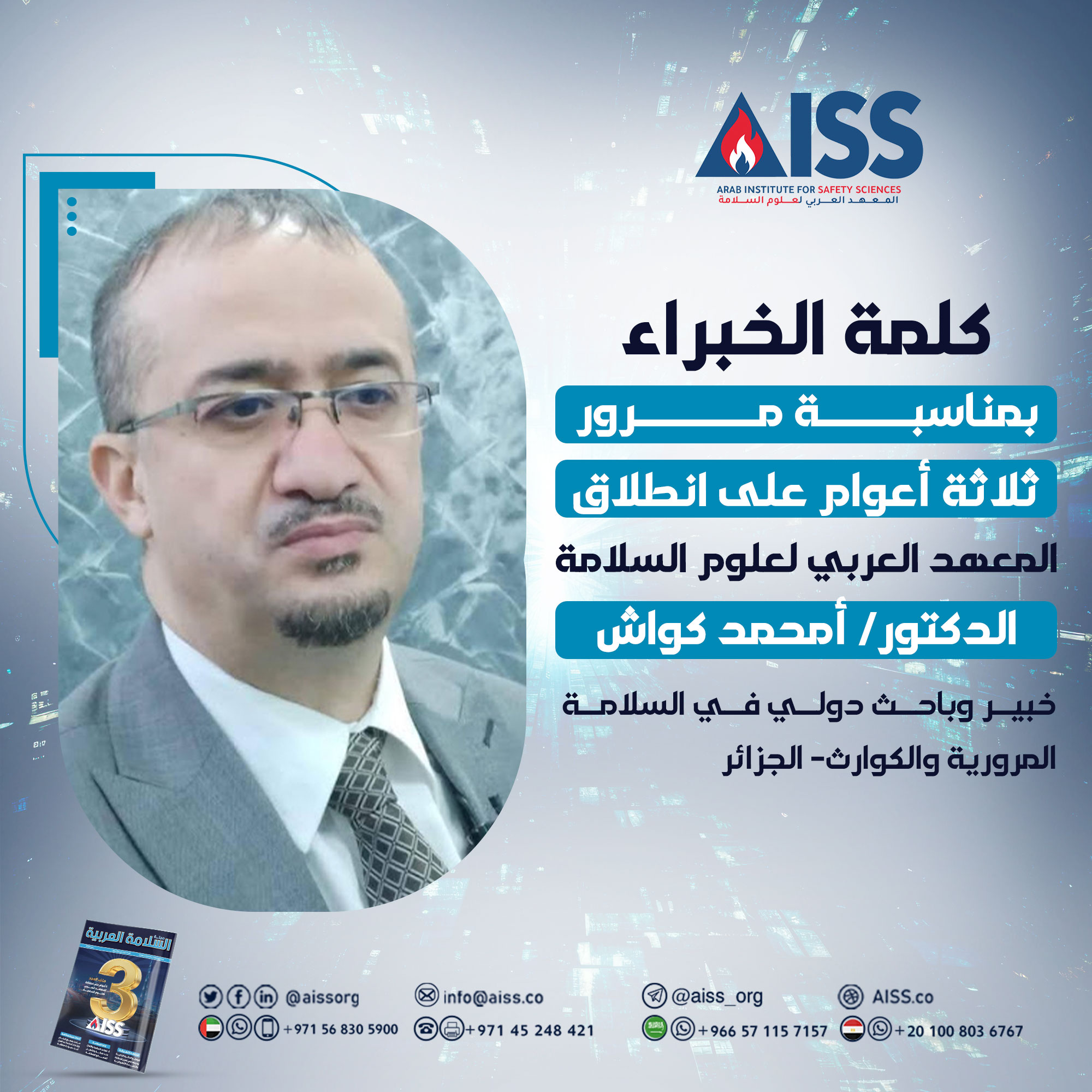 تحية شكر وتقدير للمعهد العربي لعلوم السلامة من خلال دوره في تنوير المجتمع العربي حول مختلف الكوارث التي تُهدِّد حياة الفرد والجماعة، وأمن واقتصاد البلاد، وسُبُل الوقاية منها، وذلك من خلال مقاييس الوقاية قبل وأثناء وبعد الكارثة، وانطلاقًا من مبدأ الوقاية الذي يهدف إلى الخروج بأقل الأضرار المُمْكنة من مختلف الكوارث – طبيعيةً كانت أو صناعيةً – المعتمدة على توقُّع السيئ تجنُّـبًا للأسوأ.