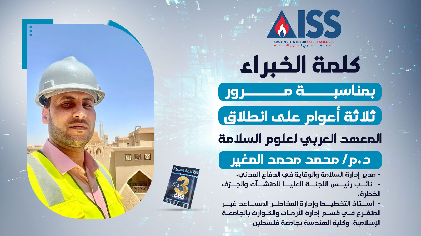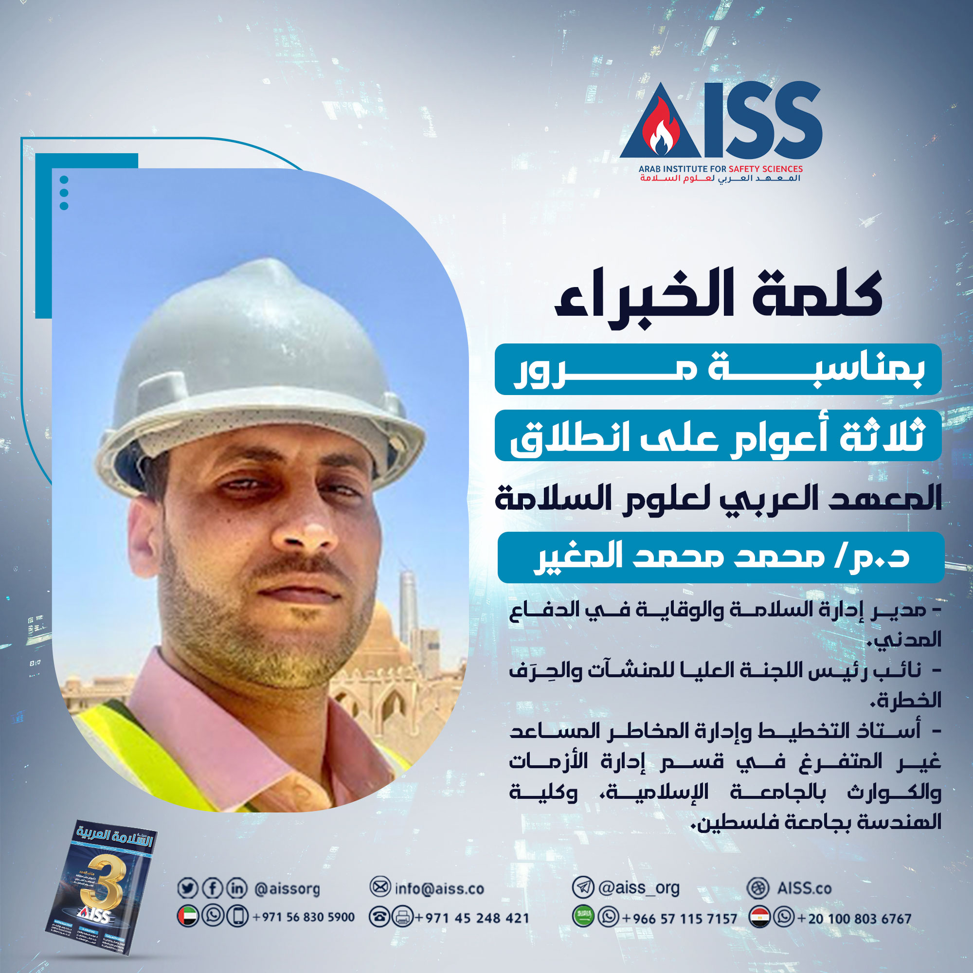 يُسْعدنـي أن أكون أحد رُوَّاد هذا المعهد المتميز، والذي أسهم في نشر ثقافة السلامة العامة، ونقل الخبرات والتجارب المتخصصة في تطوير الوسائل التقنية والفنية لتجويد السلامة في منطقتنا العربية.