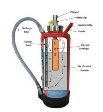 طريقة عمل أسطوانة الاطفاء واندفاع الماده خارجا بإتجاه الحريق إما بضغط الغازات التي لا تشتعل ولا تساعد على الاشتعال أو عن طريق حشوة الغاز المثبت بجانب أو داخل الاسطوانة